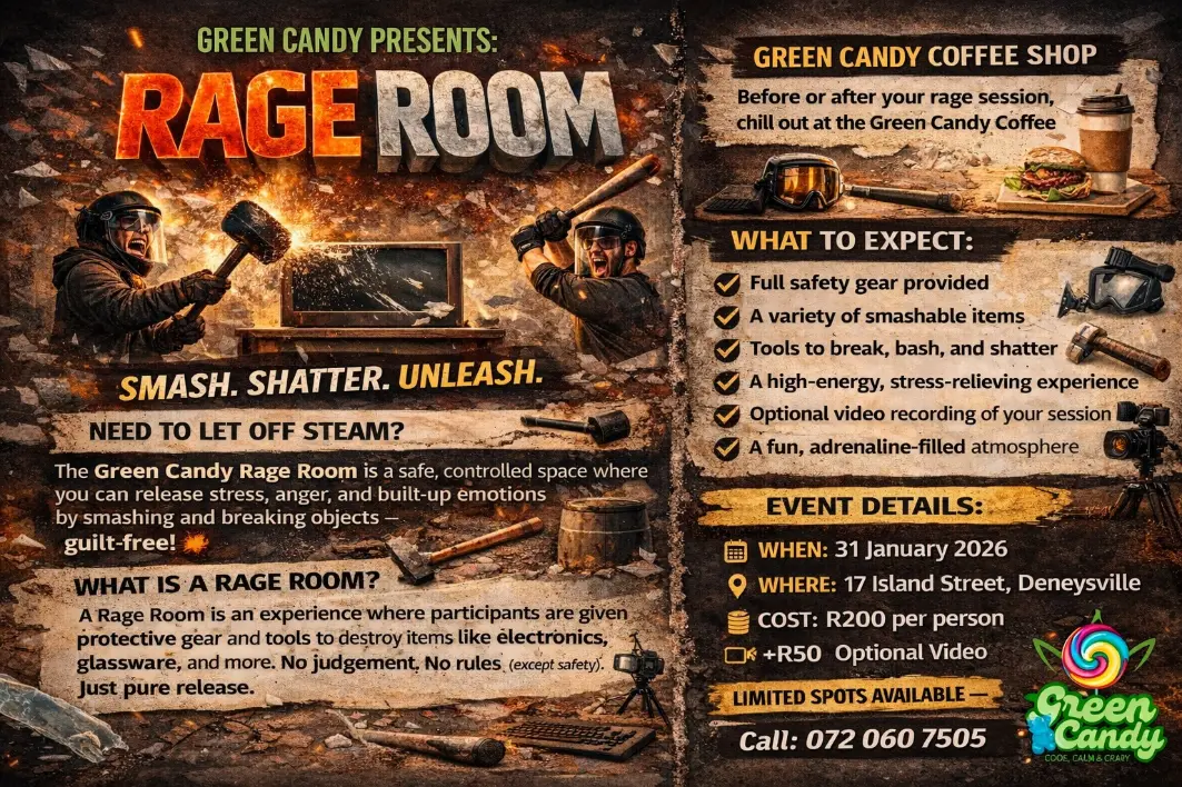 The Green Candy Rage Room is a safe, controlled space where you can release stress, anger, and built-up emotions by smashing and breaking objects - guilt free!